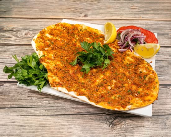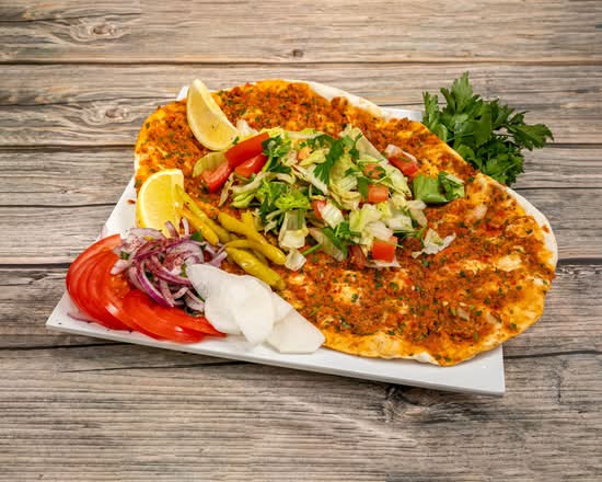 Klassischer Lahmacun, serviert mit frischem Salat.