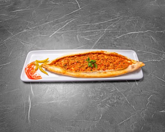 Dünner Teig mit würzigem Hackfleisch belegt.